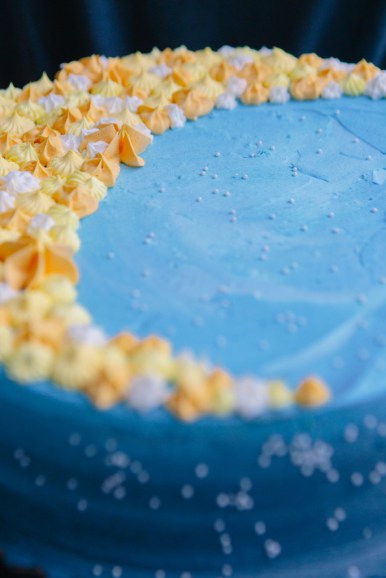 Niektóre dzieci chciałyby gwiazdkę z nieba, a moja córka zażyczyła sobie księżyc 🙂 Co się będzie ograniczać do gwiazd. Tort na drugie urodzinki małej marzycielki…kto wie może kiedyś poleci na księżyc? Tort przełożony malinami i masą cytrynową (lemon curd). Zewnętrzna warstwa jest z masy maślanej o smaku waniliowym, wykończenie zrobione tylkami.
