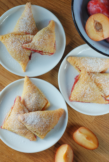 Śliwki myjemy, kroimy na pół (jeśli owoce są duże to na ćwiartki). Ciasto rozwałkowujemy i wykrawamy z niego kwadraty. Środek każdego kwadratu posypujemy łyżeczką brązowego cukru, układamy śliwkę, składamy w trójkąt i dobrze sklejamy (możemy pomóc sobie widelcem).