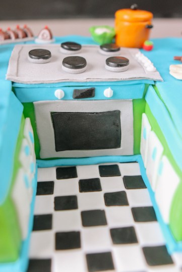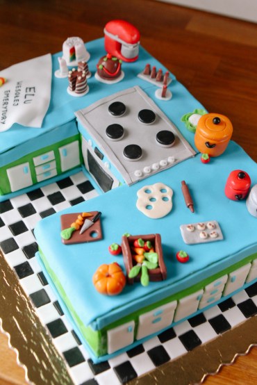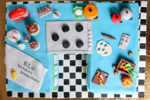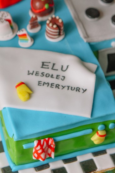 Tort na miłe rozpoczęcie emerytury zawodowej kucharki. Jak miałby wyglądać jeśli nie w kształcie kuchni? Jak dotąd jest to najbardziej pracochłonny projekt tortu jaki mieliśmy okazję wykonać. Mamy nadzieję, że efekt mówi sam za siebie. Pani Ela była zachwycona a my szczęśliwi, że mogliśmy uświetnić tak wyjątkowy dzień.