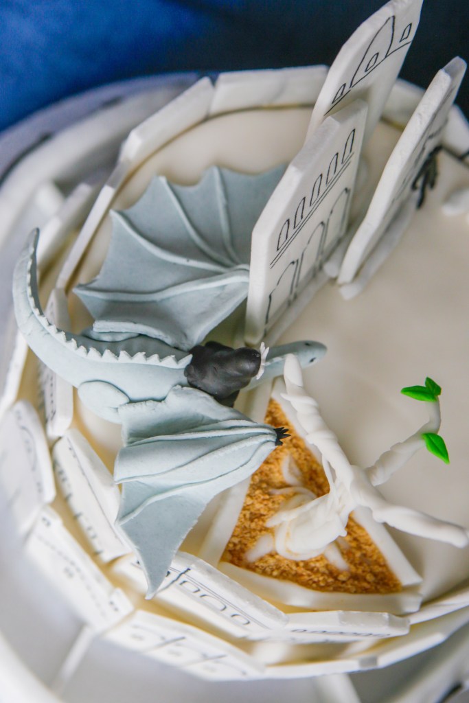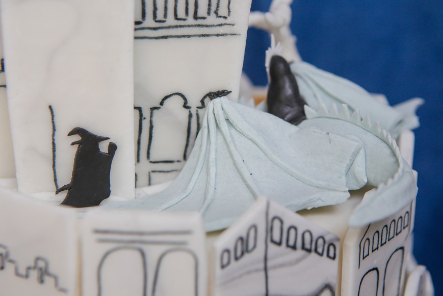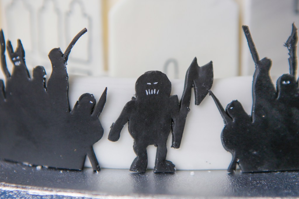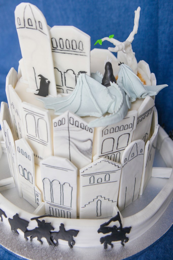 Na zdjęciach możecie znaleźć luźną interpretację tego zamówienia. Powstał tort w kształcie makiety miasta z białego marmury, przy bramie którego stoi wojsko Mordoru. Na odsiecz mieszkańców Gondoru, (którzy skrywają się za murami miasta) zmierza armia Rohanu na swoich wierzchowcach. Nieumarłych nigdzie nie widać, lecz jeśli przyjrzycie się drzewu Gondoru to zauważycie na nim zielone listki. Oznacza to, że prawowity król jest już blisko miasta na czele swojej niepokonanej armii. Jeśli chodzi o Legolasa to chyba nie ma nic bardziej kozackiego niż walka z Królem Nazguli, który zasiadł na szczycie miasta na swojej skrzydlatej bestii. Gandalf na tort trafił w ramach gratisu.